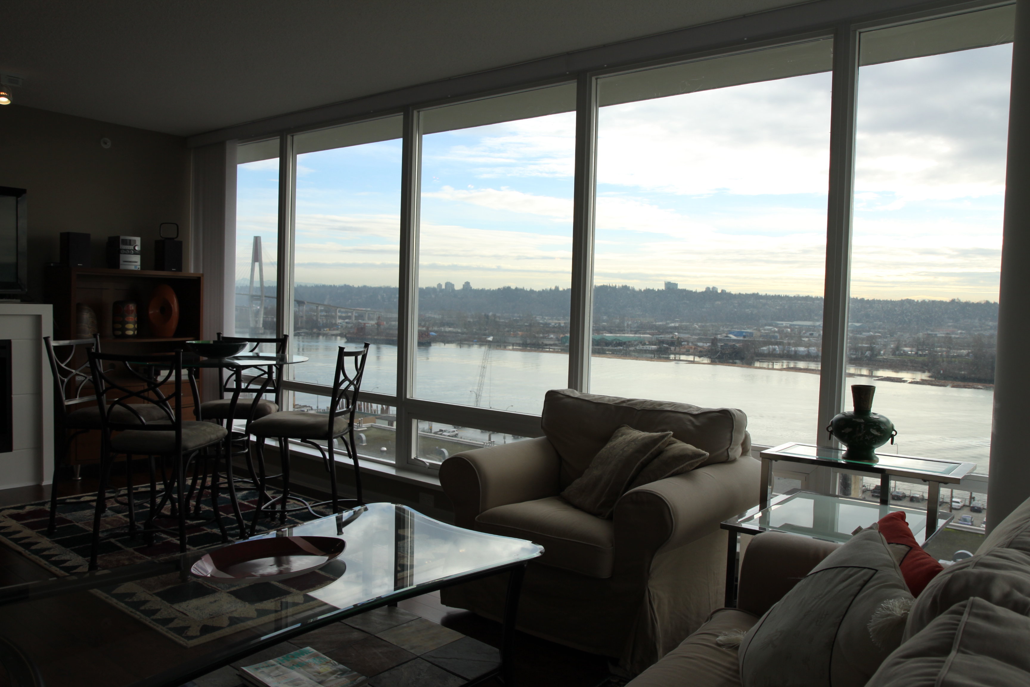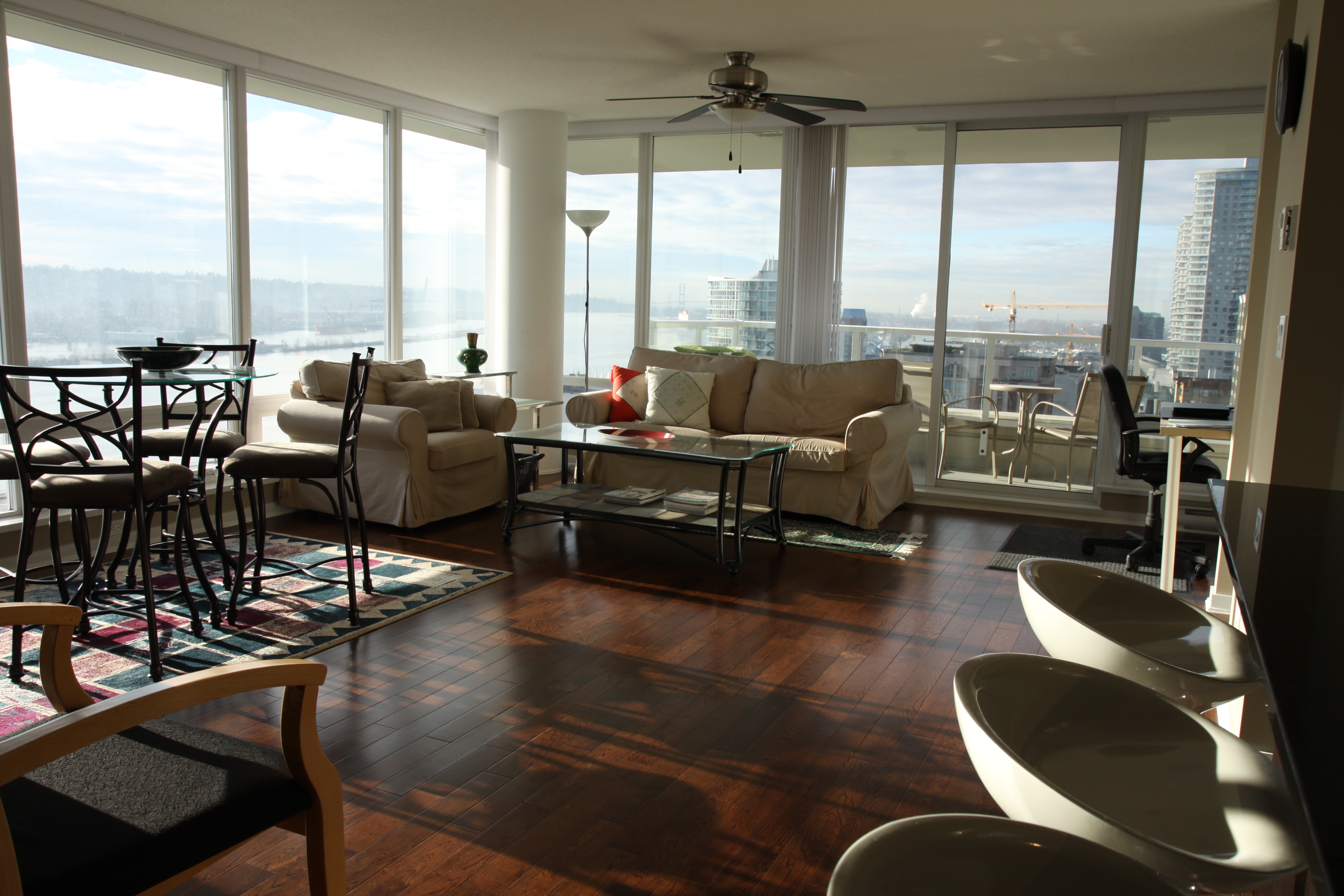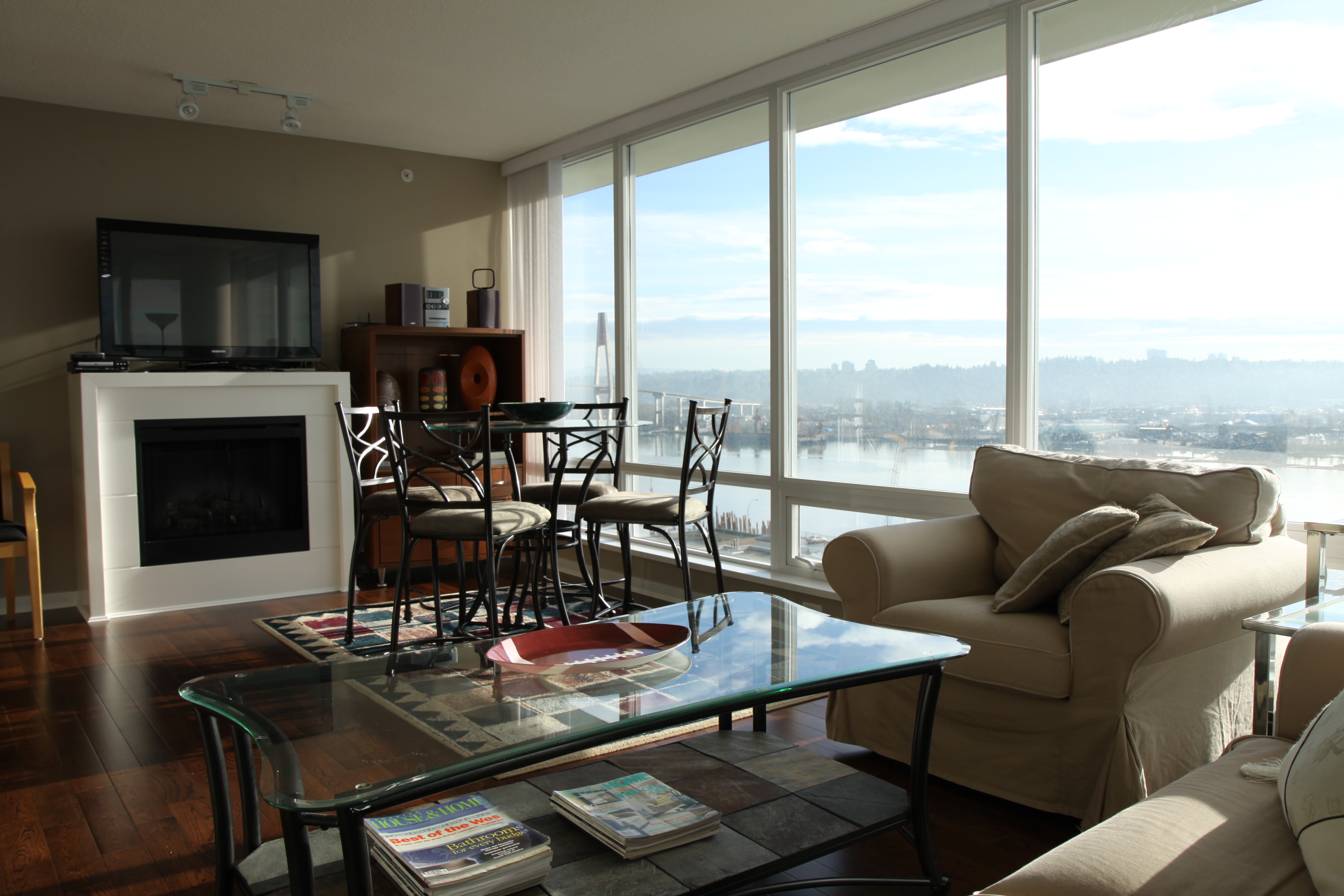 Top quality - to of its class! "Quantum" by BOSA! 270 degree views with unobstructed water views from every room as far as you can see. Spectacular night lights & city views. Perfectly laid out, 1000 SF SW corner 2 bedroom w/2 bathrooms - feels like 1200 SF! Featuring rich espresso engineered H/W floors throughout, espresso cabinets, sleek back granite countertops, S/S appls with gas stove, insuite W/D, floor-to-ceiling windows to maximize views, 70 SF covered outdoor balc w/river views, opposite bdrms for maximum privacy, office workstation, electric F/P, ceiling fan. Mint condition. 2 SxS parking, storage locker & more! Steps to skytrain station, Riverside Quay, strip malls & restaurants. Rainscreened & 2-5-10 warranty. Open House, Feb 12th & 13th, 2-4PM.